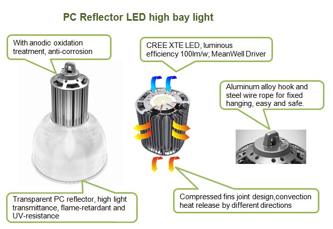 This advanced high performance light fixture is developed with Cree XTE LEDs, with high luminous efficacy 130LM/W; we also adopt a top quality Mean Well driver, which has a high power factor, long lifespan and excellent reputation among customers all over the world. A tough transparent polycarbonate reflector emits light through the sides for a greater spread of light. The polycarbonate reflector allows greater spread of light which is particularly useful in lower roofed buildings.